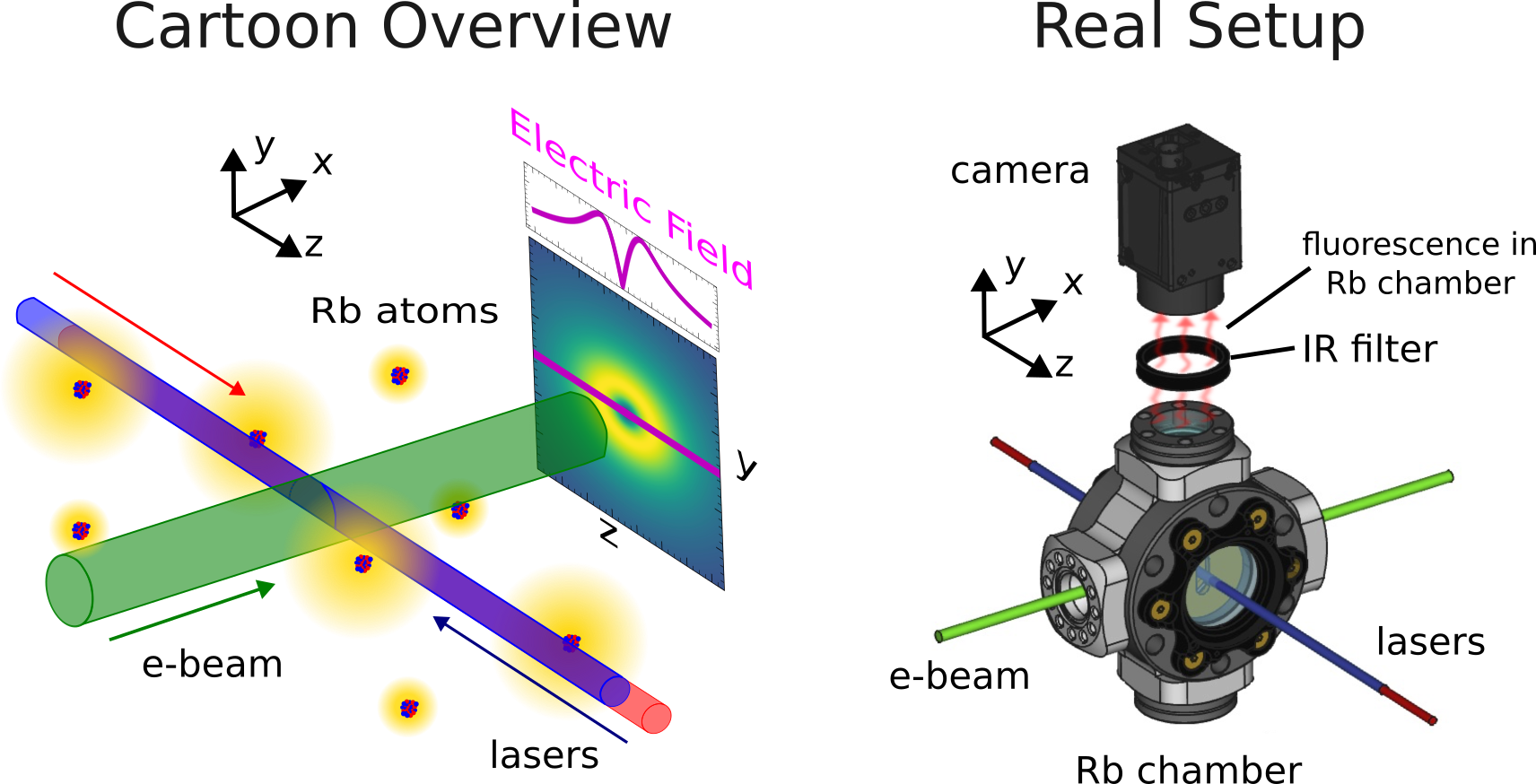 To spatially map the electric fields, it is convenient to use a camera to construct a spatial map of electric fields across the cell volume. In a collaborative effort with NIST we have been working on doing fluorescence based measurements of a probe laser in an atomic volume to map highly spatially varying fields. Here we show a cartoon overview of our detection scheme where a small number of atoms are around an electron beam. The electric field generated by the electron beam can be derived through Gauss's law as just a wire of varing levels of enclosed charge. With laser beams that are thinner than the electron beam itself we can get a cross section of the electric field created by the electron beam. We do this by using a camera to take a video of the probe laser in the cell.