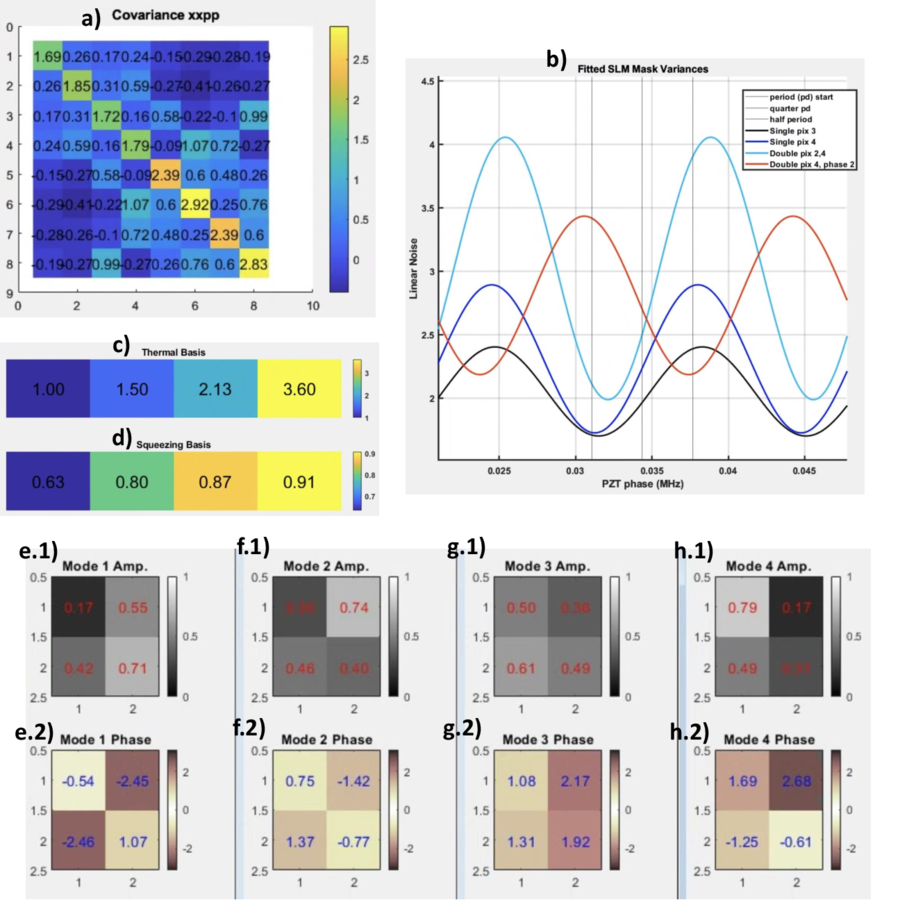 We are also able to simulate a general decomposition method in which no prior assumption of present modes are made. In the associated image, we send in four spatial Laguerre-Gauss modes (LG00,LG10, LG01, LG20) with decreasing squeezing parameters (Sqz=1/10,1/5,1/3,1/2) respectively. By comparing the variance between each axis in the quadrature picture as we rotate the noise ball, we create a full covariance matrix showing how each measurement relates to every other measurement. This matrix is then decomposed first in a thermal mode basis and then in a squeezing mode basis. From this decomposition process we are able to obtain the mode shapes, our four LG modes, and their corresponding squeezing (Sqz=1/10,1/5,1/3,1/2) and anti-squeezing parameters (antiSqz=10,5,3,2). As expected in ideal cases, squeezing is inversely proportional to anti-squeezing.